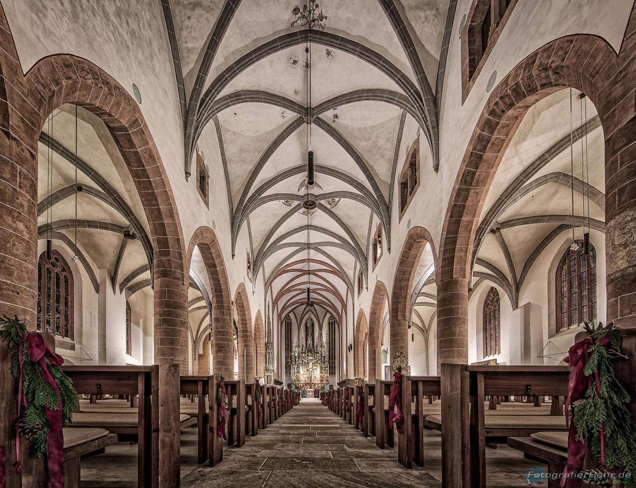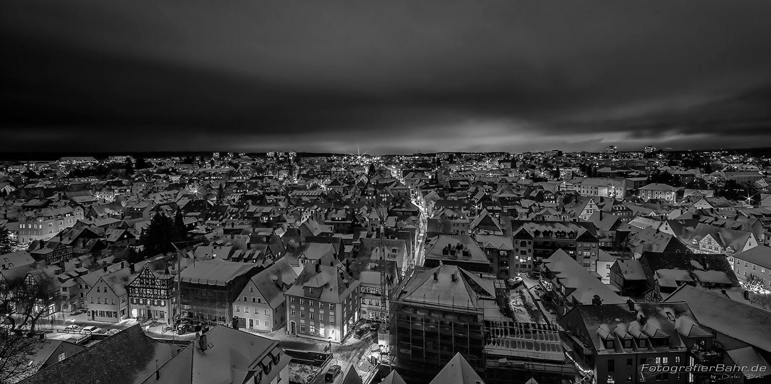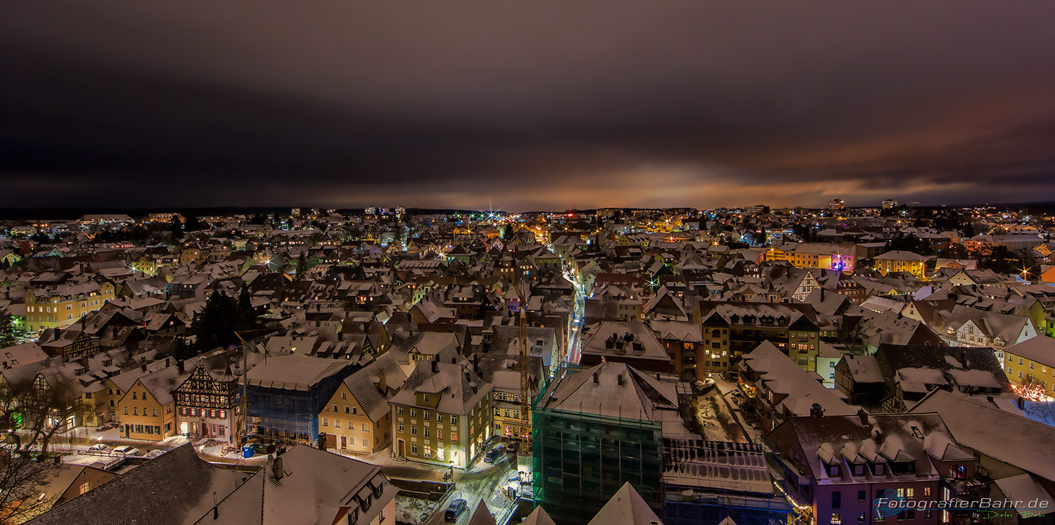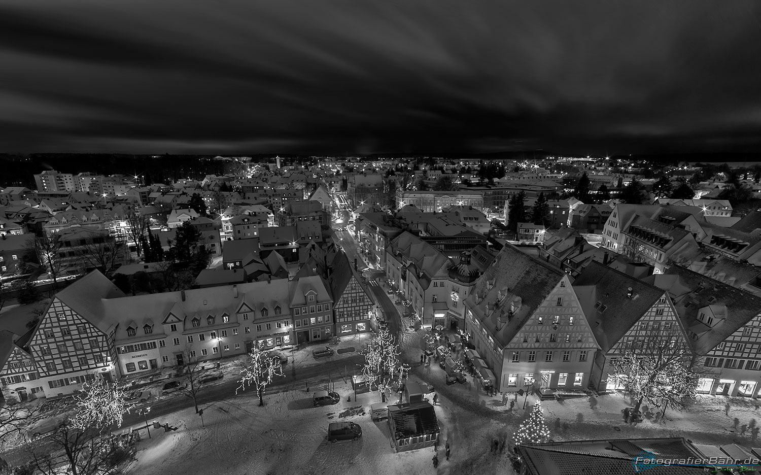 Bilder vom Schwabacher Weihnachtsmarkt von oben, der Bilck vom Kirchturm der Stadtkirche Stadtkirche St. Johannes und St. Martin in Richtung Nürnberg und ein Bilder der Stadtkirche von innen.