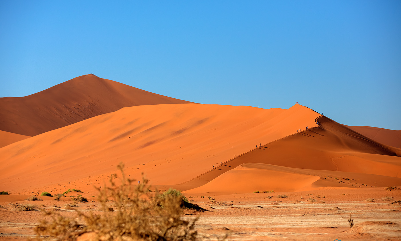 Sossusvlei, die Namib Sanddünen. Sossus bedeutet in der Sprache der Nama "blinder Fluss", da der Fluss (Tsauchab), wenn er den mal Wasser hat, in den Sanddünen verschwindet. Die Dünen sind von der Pfanne aus ca. 380 - 400m hoch. Die Farbe kommt durch das enthaltene Eisendioxid.
