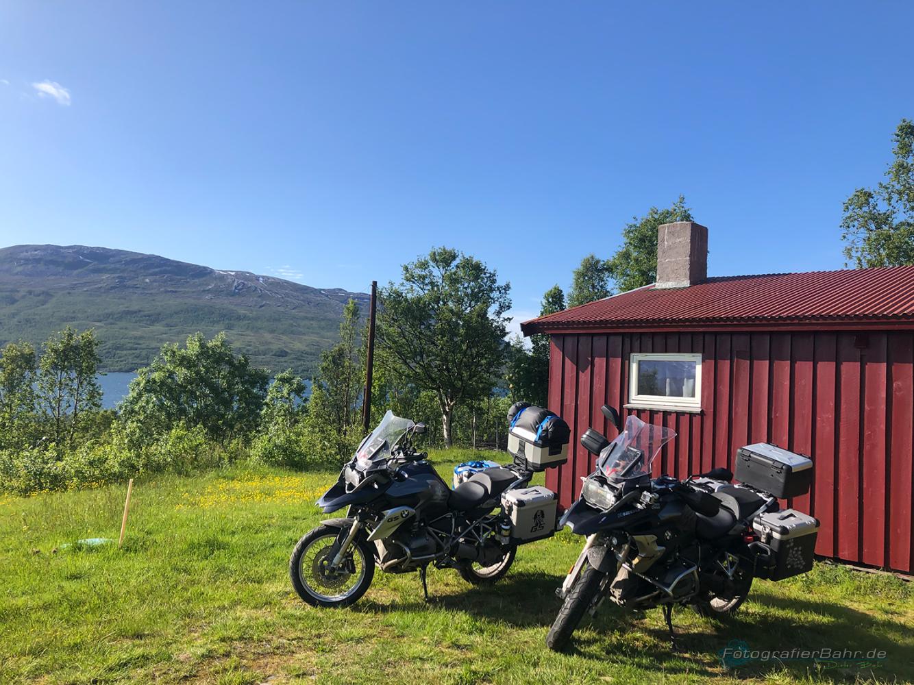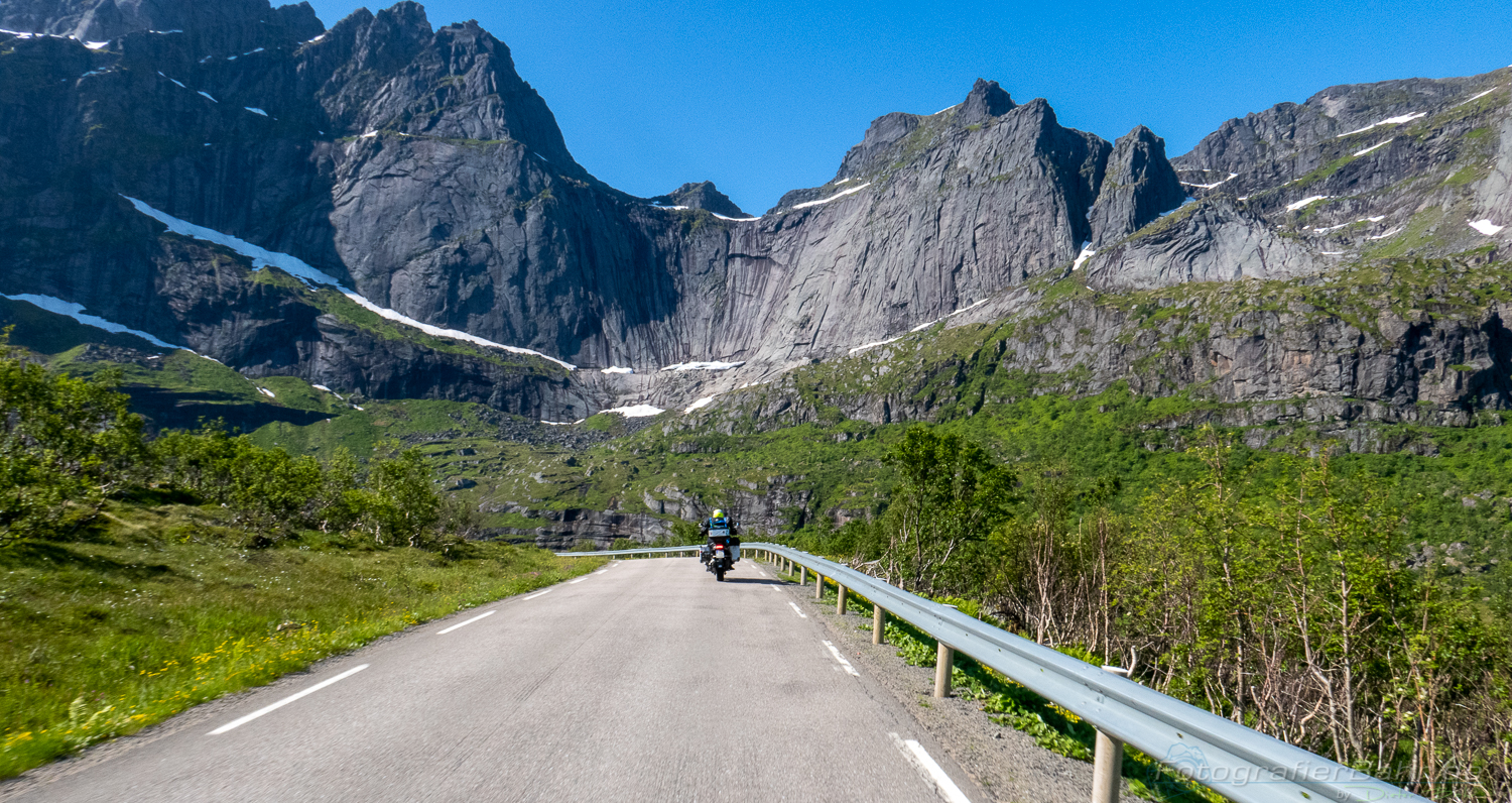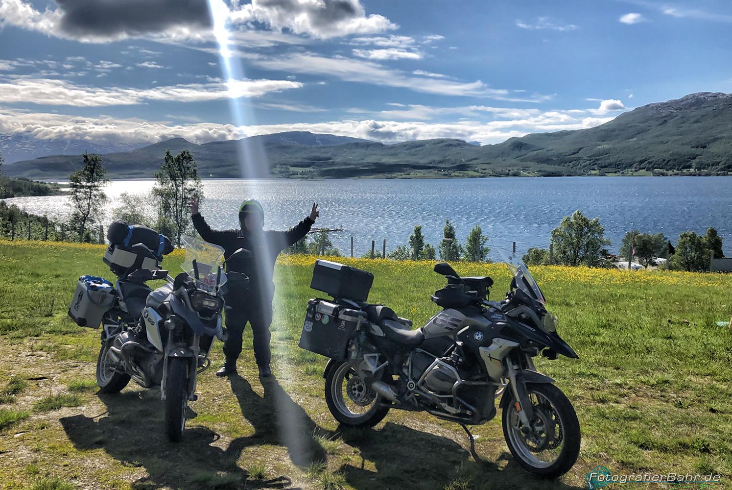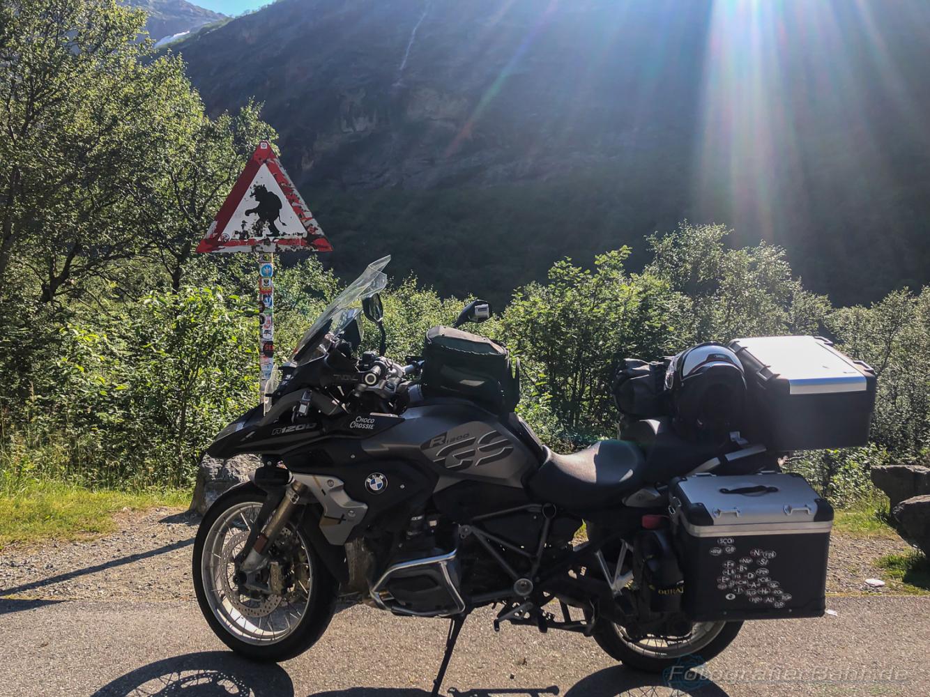 Mit dem Fährplan und einem Start um 5:30 hatten wir bezüglich der Fähren dann einen Lauf! Yes! Und so kamen wir eigentlich jeden Tag erheblich weiter als es die Routenplanung vorgesehen hatte. Klar, mit nem Moped ist das fahren auf den kleinen Strassen einfacher als mit nem Karton, so bezeichne ich die Wohnmobile. Die norwegischen Lastwagenfahrer hingegen nennen sie „die weiße Pest“, da die Wohnmobile oft viel weniger als die vorgeschribenen 80 auf Landstraßen fahren.
