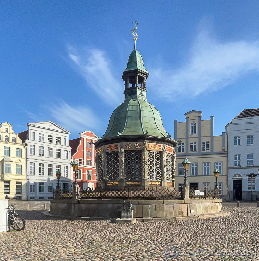 Wasserkunst Wismarer MarktplatzDie Hansestadt Wismar hatte ich mir, da ich mich nicht wirklich vorher über die Größe und die Einwohnerzahl informiert hatte, größer vorgestellt. Schon weil ich mit Hansestadt eine große Stadt verbunden hatte, so wie Hamburg, Bremen oder Lübeck.