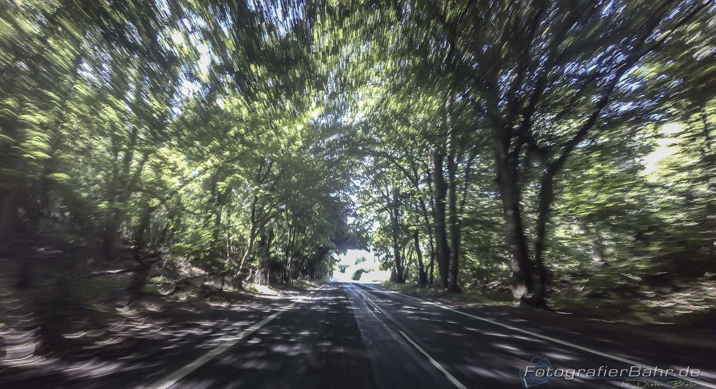 Die Straße ist kurvig, hügelig, aber da es sprichwörtlich die „Katzen und Hunde“ geregnet hat und noch dazu dicker Nebel war von der schönen Landschaft nicht viel mit zu bekommen.